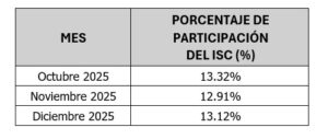 For this purpose, in order to determine the maximum monthly refund limit, SUNAT has approved the percentage share that the ISC has represented in the price per fuel unit for the following months: