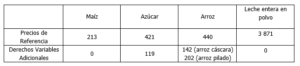 APRUEBAN PRECIOS DE REFERENCIA Y DERECHOS VARIABLES ADICIONALES A LAS IMPORTACIONES DE LOS PRODUCTOS: MAÍZ, AZÚCAR, ARROZ Y LÁCTEOS